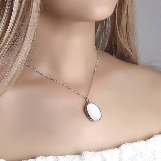 Embossed Oval Photo Locket Necklace With Engraving Platinum Plated